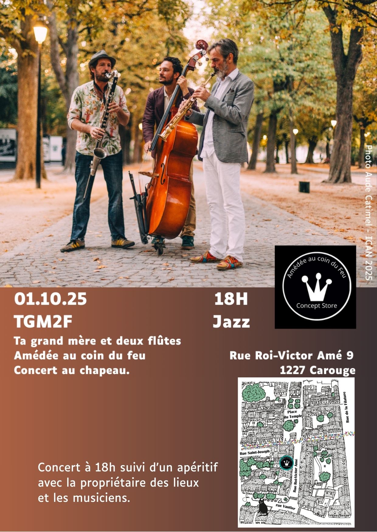 Ta Grand Mère et deux Flûtes, groupe de jazz carougeois à découvrir urgemment le vendredi 1er octobre. La contrebasse, la clarinette et le saxo vont faire joliment vibrer les pierres de ma petite boutique...